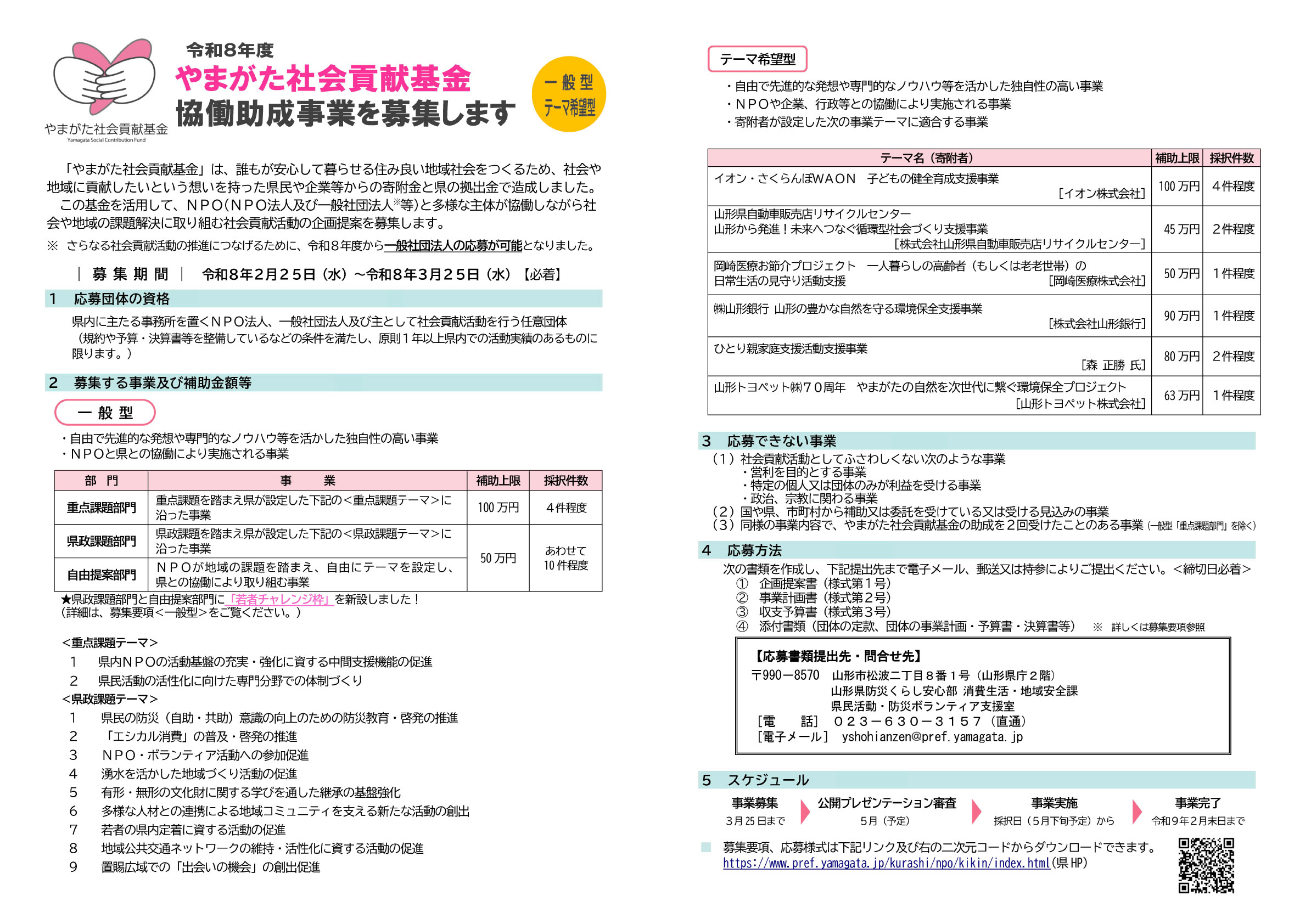 令和8年度やまがた社会貢献基金協働助成事業の募集が始まりました 2026年2月25日2026年2月25日 特定非営利活動パートナーシップオフィスお知らせ やまがた社会貢献基金協働助成事業の募集が始まりました。 詳しくは山形県県民活動・防災ボランティア支援室の、やまがた社会貢献基金のページをご確認ください。 やまがた社会貢献基金のページ(外部リンク)
